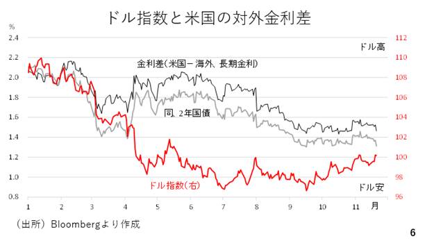 ドル指数は利下げを再開した9月中旬以降、持ち直してきましたが、今週は米金利低下による金利差の縮小により、上昇が抑えられた格好です。もっとも、9月および10月の利下げ後もドル高が進んだ通り、織り込み済みの利下げによってこれ以上、ドル安が進むわけではないでしょう。特に、12月利下げの織り込みがかなり進んでいることから、次なる利下げがドル安を招く展開は見込みにくいでしょう(スライド6)。
