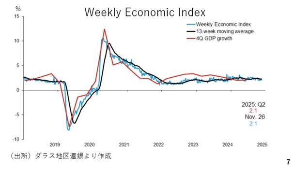 加えて、ウォラー理事も来年以降については、会合ごとに利下げを判断すると発言しています。そこで、アメリカ経済の事前推計値であるダラス地区連銀のウィークリーエコノミックインデックスを見てみましょう。これは日次と週次の10種類の民間データを元に前年比で見たGDP成長率を推計したものです。