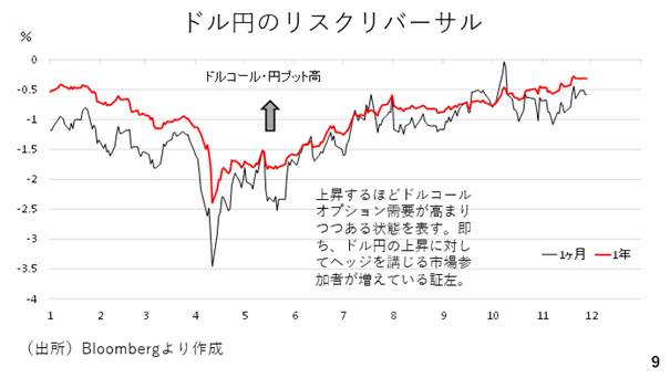 ただし、通貨オプション市場のリスクリバーサル(RR)を見る限り、長い目でみたドル円上昇観測が根強いようです。これは上に上がるほど、ドル高円安への備えとしてのドルコールオプションの人気が高まっていることを示しています。1ヵ月物のRRは総裁選直後の水準に達していませんが、1年物に関しては年初来で最も高い水準に位置しており、中期目線でみたドル円の先高観が根強いようです(スライド9)。