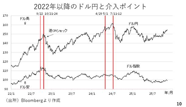 こうした経緯に照らせば、次の為替介入は少なくとも160円を超えた後と考えられます。ただ、為替のチャート分析上、160円付近は非常に重要な意味を持っており、当局も160円の防衛を意識して介入することが必要かもしれません(スライド10)。