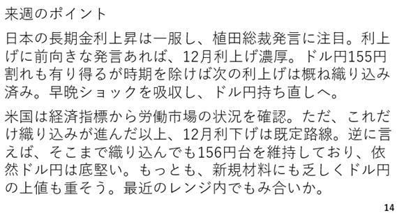一方、米国では、経済指標から労働市場の状況を確認することになりますが、すでに9割も利下げの織り込みが進んでいます。サプライズを嫌うFRBだけに12月利下げがほぼ既定路線と言っていいでしょう。それほど利下げを織り込んでも今週のドル円は156円台を維持して週末を迎えており、依然ドル円は底堅い一方、来週は新規材料にも乏しい中、ドルの上値も重そうです。この為、来週のドル円は154円台半ばから157円台の最近のレンジ内でもみ合うと予想します(スライド14)。