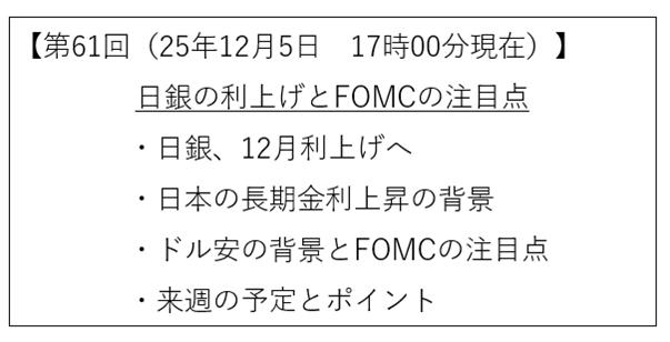 当シリーズでは、高千穂大学の商学部教授で三菱UFJ銀行の外国為替のチーフアナリストを務めた内田稔氏に、為替を中心に金融市場の見通しや注目のニュースをウィークリーで解説してもらう。※この記事は12月5日に配信された「内田稔教授のマーケットトーク 第61回 日銀利上げとFOMCの注目点」を再編集しています。ご質問はYoutubeチャンネルのコメント欄からお願い致します。