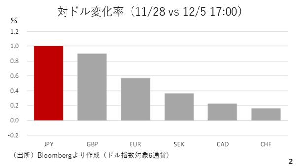 今週の為替市場では日銀の利上げ観測が高まり、円高が進みました。また、多くの通貨がドルに対して上昇している通り、今週はドル安だったこともわかります。今週はこの円高とドル安によってドル円は何度か155円を割り込む場面が見られました(スライド2)。