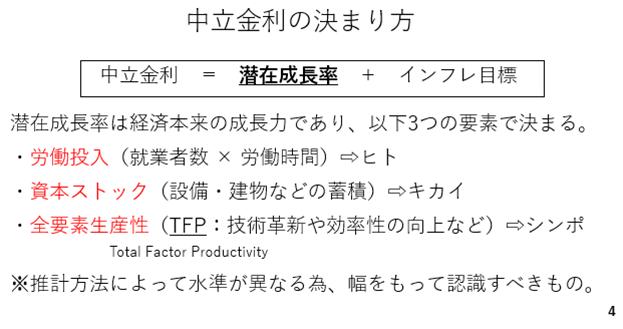 もう少し詳しく中立金利について解説しておきましょう。中立金利は、潜在成長率とインフレ目標の合計です。潜在成長率は労働投入、資本ストック、全要素生産性の3つの要素によって決まります。