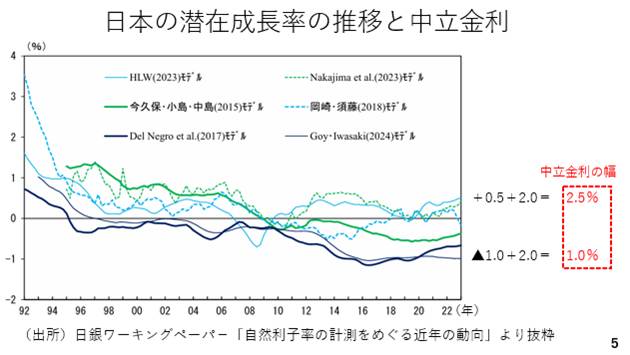 例えば、現在日銀のホームページに掲載されている資料によれば、日本の潜在成長率は最も低いもので▲1%と算出されており、最も高いモデルで0.5%です。従って、ここにインフレ目標の2%を加えた1.0%から2.5%が日本の中立金利とされているわけです。