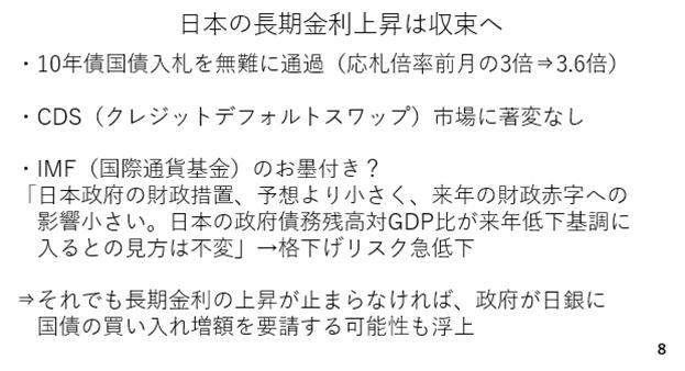 さらに、4日には国際通貨基金が日本の政府債務残高の対GDP比が低下するとの見方を変える必要はないとコメントしました。経済対策による財政悪化への影響が限定的であるとする国際的なお墨付きを得た形です。