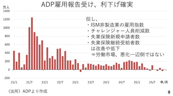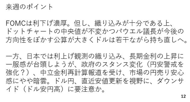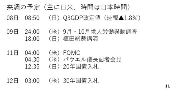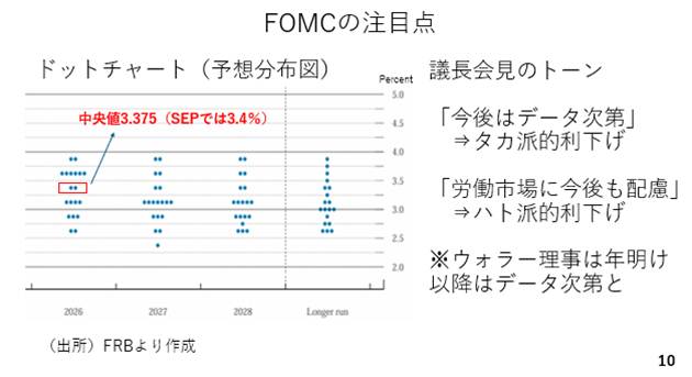 もっとも、ハト派とされるウォラー理事でさえ、来年以降はデータ次第と述べています。パウエル議長の任期が来年5月に迫っていることもあり、年が明ければ、そろそろ後任へのバトンタッチも意識するはずです。その意味も含め、パウエル議長はデータ次第である点を強調するのではないでしょうか(スライド10)。つまり、あまりドル安を促す内容とはならないはずです。