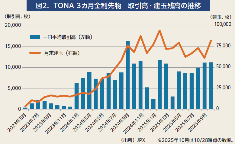 2023年5月に大阪取引所で取引を開始したTONA3カ月金利先物は、2025年3月13日に建玉残高が10万枚を突破し、順調に市場拡大中である(図2)。日銀の金融政策の正常化が始まったとはいえ金利水準はまだ低いが、2025年第3四半期(7〜9月)の一日平均取引高は約1万枚と安定的に推移している。TONA3カ月先物は2年先の限月まで安定的な流動性があり、金融機関による顧客との金利スワップ取引のポジションのヘッジに活用されているほか、金利スワップとのコンベクシティトレードや、期先限月と2年国債との組み合わせ取引も見られる。カーブ取引の需要に応え、カレンダー・スプレッドの1-2、2-3、3-4、4-5限月へのマーケットメイカーによる継続的な気配提示が行われている。投資家属性は、当初は海外投資家が中心だったが、国内投資家の参入も進んでいる。投資家のパイが増えるに従い、日銀の金融政策に係る期待を反映する金利指標として機能することが期待できる。