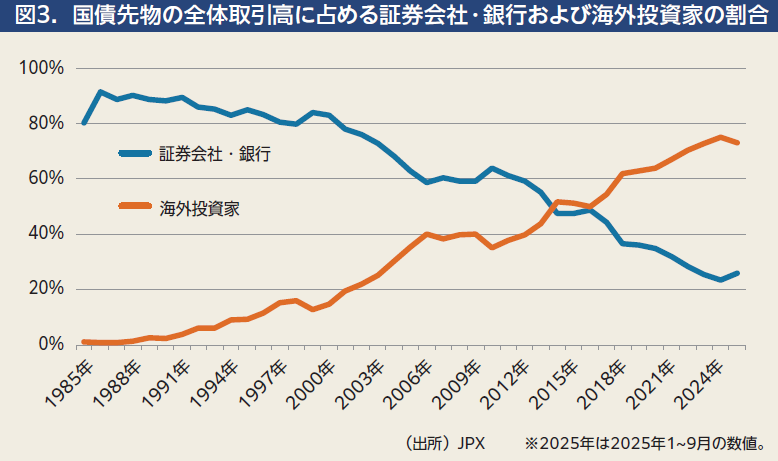 2007~2008年のサブプライムローン問題に端を発した世界金融危機を経て、2010年に米国で成立したドッド・フランク法やバーゼル規制を始めとする金融危機を防ぐための規制強化により、銀行・証券は自己トレーディングの規模を大幅に縮小した。特に国内債券市場では、2013年以降は低金利環境下で収益機会を失い、この流れが顕著となった。長期国債先物の銀行・証券の自己部門の取引高は、2024年時点で最も活発だった1980年代後半と比較して6分の1程度まで減少した。一方で、長期国債先物の全体の取引高は2008年の金融危機を脱した2013~2022年の間は横ばいであり、2022年~2024年は増加傾向にある(図4)。銀行・証券の自己トレーディングの減少分を埋めたのは、海外投資家の増加である。海外投資家は2024年時点で全体取引高の70%超を占める。