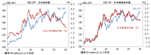 ・日米金利差は為替を論じる上で絶対的な尺度ではないが、ここまでの方向感相違は筆者を含む多くの市場関係者にとって予想外であったとみられる。そして筆者の知る限り、為替が金利差離れした理由について、膝を打つような説明・データはない。それでも金利差離れを引き起こしたと考えられる理由は複数ある。まず、日本の政策金利の天井の低さが意識されている可能性は濃厚だろう。日銀の予想ターミナルレートの代理指標として2年先1年金利に目を向けると1.6%であり、あと3回の利上げでそこに到達する。この間、債券市場で観察される予想インフレ率は1.98%まで上昇しており、市場参加者がインフレ定着・加速を強く意識していることが窺える。積極財政がインフレ予想を高めることを通じて、市場参加者の政策金利予想が上昇する構図があるように思える。
