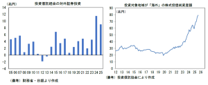 ・そして新NISA開始を契機に勢いづいた家計の海外資産投資も見逃せない。財務省・日銀が集計する「投資家部門別対外証券投資」に目を向けると、投資対象が海外である投資信託の資金流入動向を反映する「投資信託委託会社等」が巨額のプラス(買い越し)を記録している。その大半が円売りを伴う投資であると推察され、これが円安要因になっている可能性が高い。2022年に1.9兆円だった買い越し額は、2023年に4.5兆円に増大した後、新NISA元年の2024年は11.5兆円と著しく増加、2025年も9.0兆円と巨額であった。家計が海外(主として米国)の成長を、証券投資を通じて享受しようとする動きは以前からの潮流であるが、ここ数年は円安の防衛策として外貨建て資産を保有することが徐々に一般に浸透しており、そうした下で家計の外貨選好が高まっていると思われる。投資信託協会のデータによれば、投資対象地域が「海外」とされている投信は2025年末時点で79.4兆円の残高があり、この5年間で3倍超の増加を遂げている。純資産残高は値上がり分が含まれるため、新規流入額を簡易的に算出(設定-解約・償還)すると、2015年以降の累積で32.1兆円、直近の2年間では16.3兆円の増加となっている。その他に投資信託協会が「内外株式」に分類しているファンド(2025年末時点で71.1兆円)や外貨預金、ETF、私募投信を通じた海外投資の存在があり、それらも買い越しとなっている蓋然性が高い。