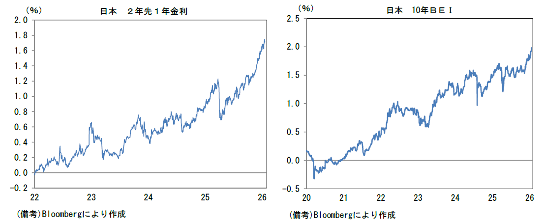 ・日米金利差は為替を論じる上で絶対的な尺度ではないが、ここまでの方向感相違は筆者を含む多くの市場関係者にとって予想外であったとみられる。そして筆者の知る限り、為替が金利差離れした理由について、膝を打つような説明・データはない。それでも金利差離れを引き起こしたと考えられる理由は複数ある。まず、日本の政策金利の天井の低さが意識されている可能性は濃厚だろう。日銀の予想ターミナルレートの代理指標として2年先1年金利に目を向けると1.6%であり、あと3回の利上げでそこに到達する。この間、債券市場で観察される予想インフレ率は1.98%まで上昇しており、市場参加者がインフレ定着・加速を強く意識していることが窺える。積極財政がインフレ予想を高めることを通じて、市場参加者の政策金利予想が上昇する構図があるように思える。