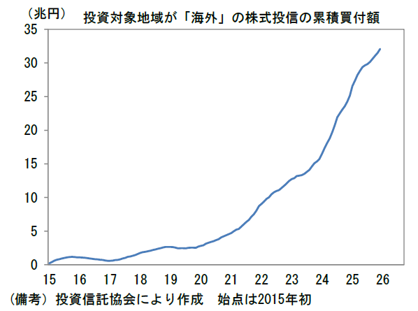 ・そして新NISA開始を契機に勢いづいた家計の海外資産投資も見逃せない。財務省・日銀が集計する「投資家部門別対外証券投資」に目を向けると、投資対象が海外である投資信託の資金流入動向を反映する「投資信託委託会社等」が巨額のプラス(買い越し)を記録している。その大半が円売りを伴う投資であると推察され、これが円安要因になっている可能性が高い。2022年に1.9兆円だった買い越し額は、2023年に4.5兆円に増大した後、新NISA元年の2024年は11.5兆円と著しく増加、2025年も9.0兆円と巨額であった。家計が海外(主として米国)の成長を、証券投資を通じて享受しようとする動きは以前からの潮流であるが、ここ数年は円安の防衛策として外貨建て資産を保有することが徐々に一般に浸透しており、そうした下で家計の外貨選好が高まっていると思われる。投資信託協会のデータによれば、投資対象地域が「海外」とされている投信は2025年末時点で79.4兆円の残高があり、この5年間で3倍超の増加を遂げている。純資産残高は値上がり分が含まれるため、新規流入額を簡易的に算出(設定-解約・償還)すると、2015年以降の累積で32.1兆円、直近の2年間では16.3兆円の増加となっている。その他に投資信託協会が「内外株式」に分類しているファンド(2025年末時点で71.1兆円)や外貨預金、ETF、私募投信を通じた海外投資の存在があり、それらも買い越しとなっている蓋然性が高い。
