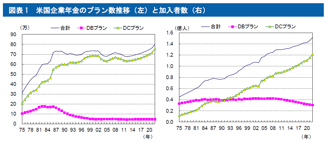 「自動加入化」が注目されるようになったのは、1990年代後半以降である。米国の企業年金は、1970年代から80年代にかけて確定給付型(DB)プランが主流だったが、80年代後半以降、DCプランの新設が急増した(図表1左)。90年代に入ると、DCプランの加入者数がDBプランを超え、その後、DCプランの加入者数は増加し続けている(図表1右)。