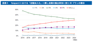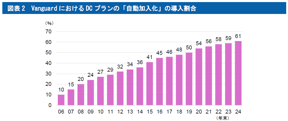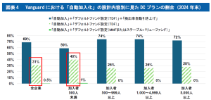 次に、「自動加入化」の内容について確認する。Vanguardによると、2024年末時点で「自動加入化」を導入するプランの69%が「自動加入」「デフォルトファンド設定(TDF)」「拠出率の自動引き上げ」の3つを導入している(図表4)。佐川(2025)で確認したように、近年、DCプランの中で最も普及している401(k)プランにおいて、加入者全体の資産額に占めるTDFの比率が高まっており、特に若年層で顕著である。これはデフォルトファンドにTDFを設定した「自動加入化」の普及による影響が大きく、若年層で顕著なのは「自動加入化」で加入する者の中に若手の新入社員が多いためだろう。一般的に、TDFは若年期の株式比率が高く設定されている。近年は、株高によりTDFが保有する株式の資産価格が上昇しているとみられ、若年層の401(k)プランの資産額が増加している可能性は高い(※5)。