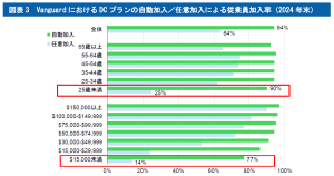例えば、Vanguardがサービスを提供するDCプランでは、「自動加入化」を導入する割合が2006年末の10%から2024年末には61%へと上昇している(図表2)。2024年末時点で導入しているプランの従業員の加入率は94%と、導入していないプラン(任意加入)の64%に比べて大幅に高い(図表3)。これを加入者の年齢別、収入別に見ると、特に25歳未満や年収15,000ドル未満の従業員の加入率に大きな差異が見られ、自動加入プランが若年層や低所得者層の加入率の向上に大きく寄与していることがわかる。また、T.Rowe Priceがサービスを提供するDCプランでも、2024年で68%が「自動加入化」を導入しており、導入しているプランの加入率は85%と、導入していないプランの41%を大幅に上回っている(※4)。