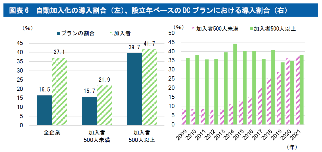 一方、確かに「自動加入化」の導入は広がってきたが、大規模のDCプランと比べて中小規模のプランでは、導入状況はあまり芳しくない。米国議会調査局(CRS)の調査によると、2021年にDOLに年次報告書を提出したDCプランのうち、「自動加入化」を導入する割合は16.5%(加入者ベースで37.1%)と、VanguardやT.Rowe Priceと比較して低くなっている(図表6左)。加入者数規模別では、500人以上のプランは39.7%だが、500人未満では15.7%と低い。