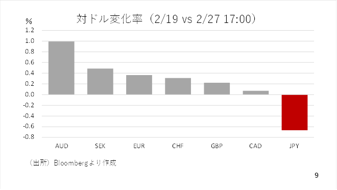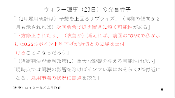 一方、金融政策においては、ややドルサポートの動きが見られました。1月のFOMCにおいて、政策金利据え置きとの決定に対して反対票を投じるなど、ハト派とされるウォラー理事が2月の雇用統計でも1月分と同様に、予想を上回った場合、3月のFOMCにおいて据え置きに同調する姿勢をみせたのです。