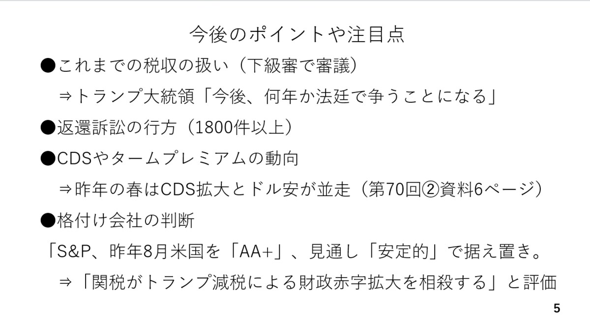 例えばS&Pは昨年8月、アメリカの格付けを「AA+」、見通しも「安定的」で据え置きましたが、その際の大きな根拠となったのが関税だったからです。総じてみれば、関税に違憲判決が下されたことは潜在的なドル安材料として認識しておく必要があるでしょう(スライド5)。