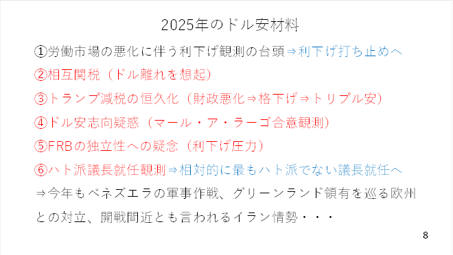 また、足元ではイランとの緊張が高まっています。このイランとの緊張激化は「有事のドル買い」となることも予想され、必ずしもドルに対してネガティブに作用するわけではありませんが、引き続きトランプ大統領を材料とするドル安に要注意です(スライド8)。