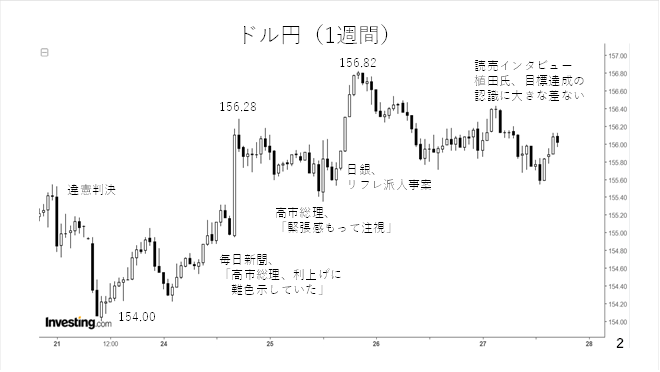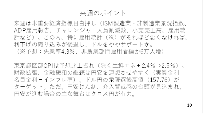 その後、高市総理が市場を注視していると発言したことが報じられたほか、物価安定目標の達成が早ければ春頃にも達成できるとの見方について、審議委員の間で大きな差がないとする植田総裁のインタビューもドル円の続伸を阻みました(スライド2)。
