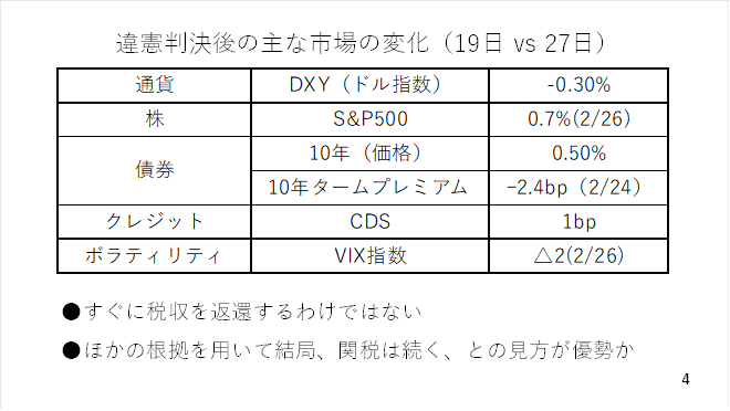 また、政府の財政に対する懸念度合いを示すタームプレミアムやCDSのスプレッドを見ても概ね横ばい圏で推移しました。恐怖指数とされるVIX指数も小幅に低下しています。結局、市場はこれまで受け取った税収をすぐに返還するわけではなく、ほかの法的根拠をもとに関税も続くとみていると考えられます(スライド4)