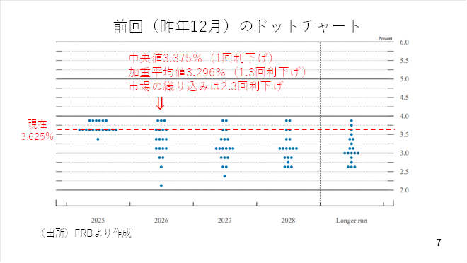 一方、19人の回答結果にはかなりバラツキがあり、その総意をみる上では加重平均値の変化にも注目です。前回は3.296%と中央値よりやや低く、1回以上の利下げを示唆する内容でした。ウォラー理事の発言にも見られる通り、次回は全体的に利下げの見方が後退し、中央値、加重平均値が全体的に上方修正された場合、ドル買い材料となるでしょう(スライド7)。