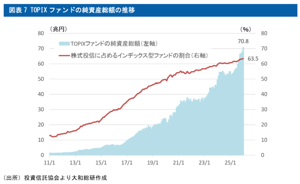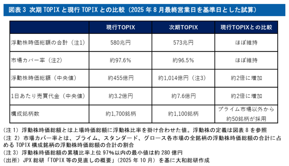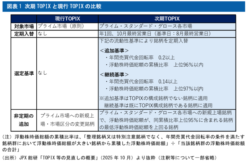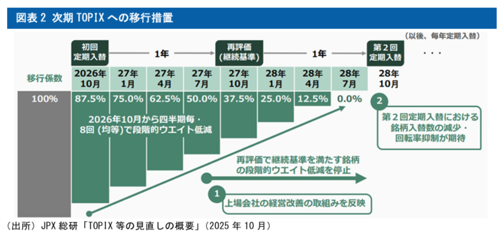■2025 年1月末に完了した第一段階のTOPIXの見直しにより、TOPIX構成銘柄は見直し前の約2,200銘柄から約1,700銘柄に絞り込まれた。2026年10月に始まる第二段階の見直しにより、TOPIXの構成銘柄は浮動株時価総額などで毎年評価され、1,000銘柄程度に絞り込まれる可能性がある。