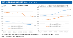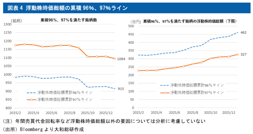 ただし、TOPIX の構成銘柄数については、今後の株式市場の物色動向や企業の浮動株比率を高める動きなどにより、大きく変わる可能性がある点には留意したい。現に、2025 年 1 月 15日時点のデータに基づいた大和証券による試算(※3)では、TOPIXの構成銘柄数は約1,000銘柄になる見通しが示されている。見直し後のTOPIXの組入基準となる浮動株時価総額の累積比率96%と97%のラインは、時価総額上位銘柄の株価が大幅に上昇したことにより、このところ上昇傾向にあることがわかる(図表4)。また、この図では、96%ラインと97%ラインの間に約100社の企業がひしめき合っている状況であり、ほんのわずかな浮動株時価総額の差が TOPIX 採用の明暗を分けることになる。