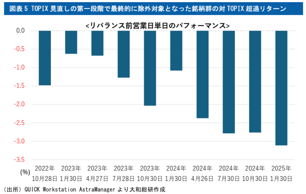 インデックスの銘柄入れ替えに伴う売買については、当該指数をベンチマークとするパッシブファンド(※4)は、トラッキングエラーを抑制する観点からインデックスの変更日(リバランス日)に売買を実施することになり、売買のインパクトもリバランス前営業日に大きくなる。図表5では、第一段階の見直しでTOPIXから最終的に除外対象となった439銘柄(※5)に等金額で投資した場合の、全10回のリバランス日における対TOPIXの超過リターンを示している。段階的にウエイトが低減される度にネガティブな影響を受けていることや、2023 年 10 月の再判定の結果、TOPIXからの除外が確定して以降のマイナス幅が特に大きいことが確認された。