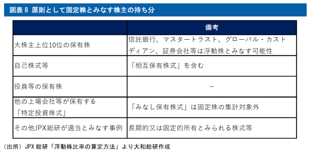 ■TOPIX から除外されると、株価にはネガティブな影響が予想される上に、一度除外されると再度組み入れられるための条件が継続採用基準より高く設定されている。発行体企業としては、2027年10月の再評価のタイミングで除外対象とならないことが重要であり、取り得る対応策は、浮動株比率の向上や株価上昇などを通じて、浮動株時価総額を引き上げることしかない。