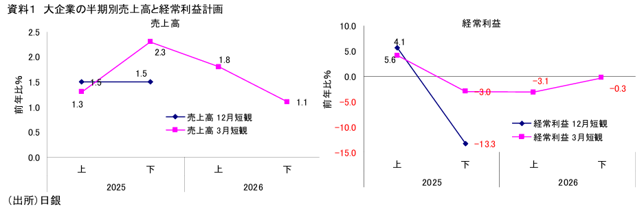 資料1は、3月短観の調査対象大企業(全産業、除く金融)が計画する半期別売上高・経常利益前年比の推移を見たものである。まず売上高を見ると、26 年度はプラス幅が縮小するものの、上期・下期とも増収計画となっている(資料1)。