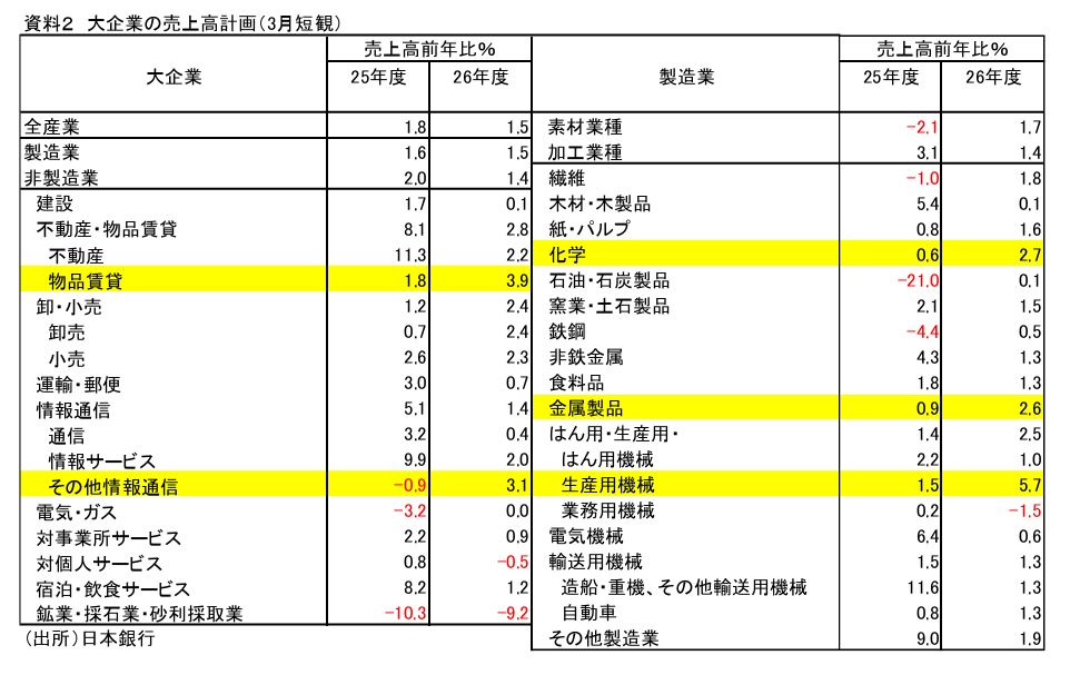 続いて、3月短観の売上高計画を基に、大幅増収が見込まれる業種を選定してみたい。資料2は25・26 年度の業種別売上高計画の前年比をまとめたものである。