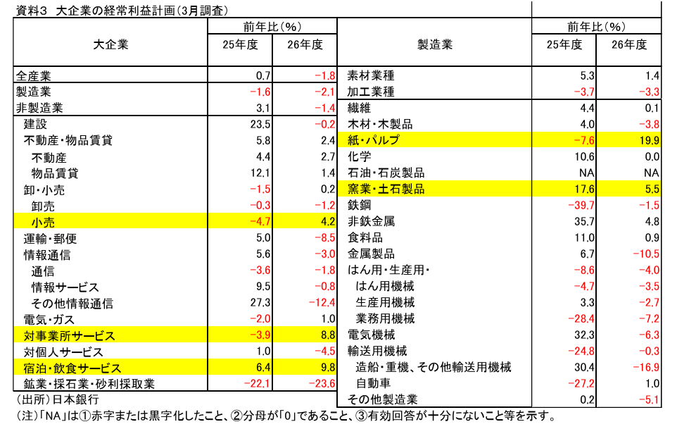 - 3月短観における 26 年度の収益計画(大企業、以下同じ)によれば、売上高は増収計画だが、経常利益については減益に転じる。ただ、イラン戦争に伴う原油高等の影響を十分織り込んでいない可能性がある。