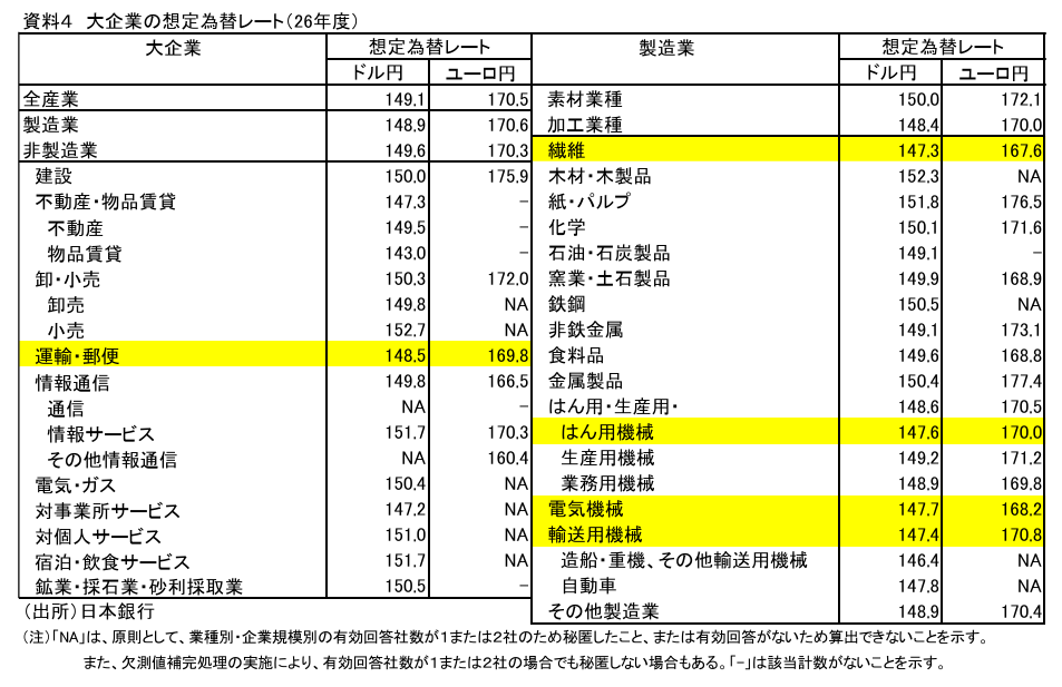 ただ、足元のドル円レートよりも特に円高で今年度の為替レートを想定しているのが「輸送用機械」や「電気機械」「はん用機械」といった輸出関連の製造業となっている。
