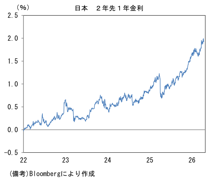 - ターミナルレートの代理指標として2年先1年金利に目を向けると、直近は1.99%とほぼ2%に到達している。3月入り後、イラン情勢の悪化に伴う原油高などの混乱を受けて、一度は利上げの織り込み度合いが剝がれる場面もみられたが、原油高による実体経済への甚大な影響が避けられるとの見方が広がるもとで、市場参加者は利上げをより高い確度で織り込むようになった。