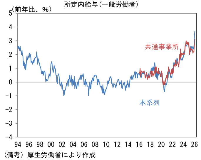 - 日銀の利上げ観測が高まる背景には、賃金と物価の上昇があり、これは日本経済の正常化と捉えることができる。その点、昨年のサンプル・バイアスが剥落したとみられる2月の毎月勤労統計、そして2026年春闘の途中集計はどちらもインフレが持続的なものであるとの見方を後押しする結果であった。2月毎月勤労統計では、サンプル要因による下押しが疑われていた卸売業・小売業の数値が急進して2024年の基調に戻ったことで、全体の数値は春闘賃上げ率などと比べて違和感のない伸び率となった。春闘賃上げ率については、連合による3回目集計時点(4月1日公表)において、ベア相当部分は3.58%となっている。連合による集計には含まれない、公的部門や非市場性部門の賃上げ動向を加味する必要はあるにせよ、3%半ばの賃上げ基調は2%の消費者物価上昇率に対して、概ね整合的といえる。こうしたデータは日銀の利上げを正当化する。