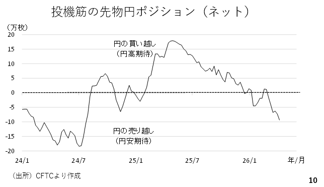 現在の投機筋のポジションをみると、円ショートが2024年の夏以来、2年ぶりの水準です。こうした円ショートの巻き戻しがドル円の下げ幅拡大をもたらす可能性があります(スライド10)。