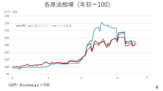 はじめに原油相場の動向です。上昇はピークアウトしましたが、ホルムズ海峡封鎖が完全に解除されるのか、懸念が残ります。その上、戦争による攻撃により、パイプラインや再選施設も損傷を受けており、供給力の低下が見込まれます。開戦前の水準まで原油価格が戻り切らないとすれば、石油輸出国であるアメリカおよびドルにとって一定の優位性が残ることになります(スライド5)。