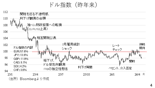 ドル指数をみると、昨年来、上値抵抗線となってきた100近辺で続伸を阻まれました。「有事のドル買い」のはく落により、今週は98付近まで軟化しています。ただ、ここからドル安基調に転じる可能性も低いとみています。理由として次の2点が挙げられます(スライド4)。