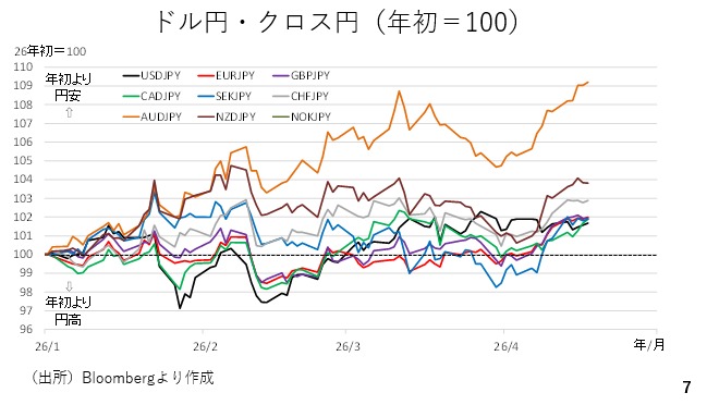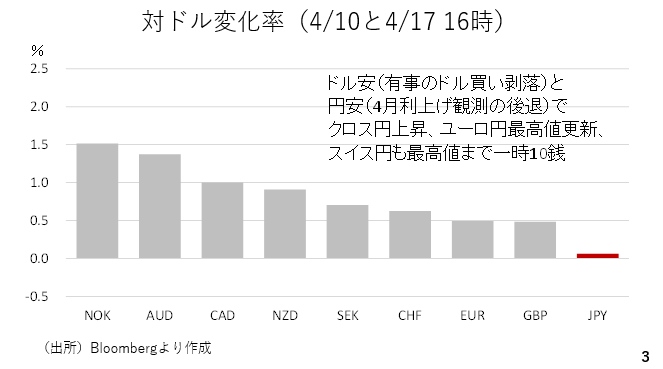 4月10日の終値と4月17日16時現在で比較した主要通貨の対ドル変化率をみると、ドルが全面安となっています。停戦協議進展への期待から緊張が和らいでおり、市場では原油価格とドルが反落した一方で株式相場と債券相場が持ち直しています(長期金利は低下)。但し、円はそのドルに次いで弱く、他の通貨に対しては軟調に推移しました。ドルも円も弱い場合、クロス円が上昇します(スライド3)。