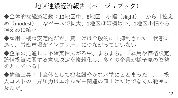 今週、米国では地区連銀経済報告(ベージュブック)が公表されました。戦時下ではありますが、各地区からの報告は必ずしも悲観一色ではありませんでした。例えば、全12地区の内、「小幅」または「控えめ」ながらも経済活動が拡大したとの報告が8地区に及びました。また2つの地区は横ばいにとどまっており、経済活動が縮小したとの報告は2地区だけでした。もちろん、先行き不透明感が強く、予断を許しませんが、すぐにも利下げを必要としている状況ではありません(スライド12)。
