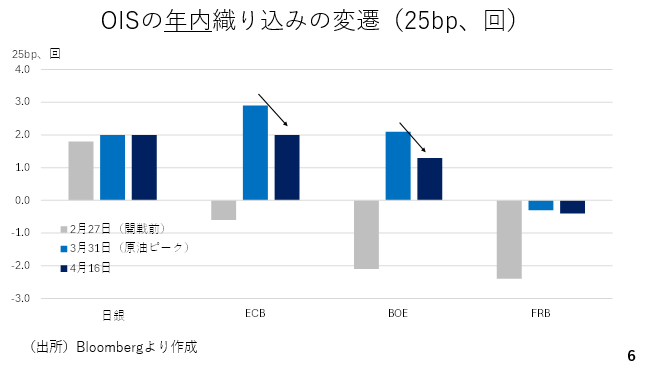 また、原油価格の上昇がピークアウトしたことにより、ECBやBOEに対する利上げ観測も和らぎました。これまでこうした利上げ観測の台頭によるユーロ高ドル安やポンド高ドル安がドル押し下げた面もありましたが、こうした経路によるドル安圧力も和らぐと考えられます(スライド6)。