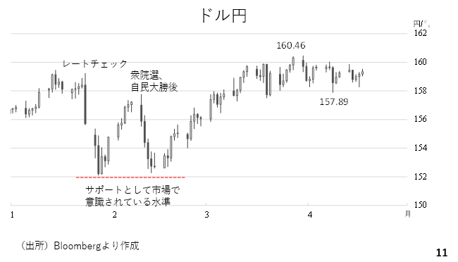 その場合、市場では152円が意識されそうです。1月下旬のレートチェック後、2月8日、自民党が大勝を収めた衆議院選挙後、それぞれドル円は大幅に下落しましたがどちらも152円台で下げ止まりました。この為、市場では152円台は強いサポートとみなされています。もっとも、仮にそこを下抜けした場合でも、ドル円が下落トレンドに転じるわけではないでしょう。