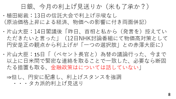 先週末まで今月会合での利上げの可能性が非常に高いと予想していましたが、今週の一連の動きを踏まえ、利上げを見送るとの予想に修正します。もちろん利上げを見送った場合でも円安に配慮し、植田総裁は利上げを続けていくスタンスを強調すると考えられ、タカ派的な利上げ見送りを演出するでしょう(スライド8)。