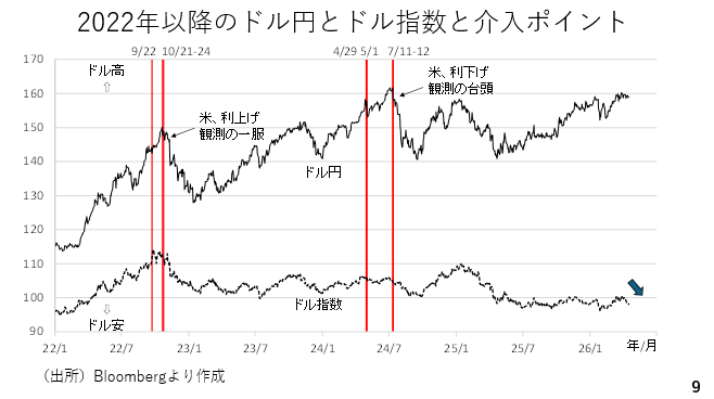 利上げが見送られた場合、ドル円は160円の大台を回復する可能性が高いでしょう。ただ、3月30日に三村財務官より「そろそろ断固たる措置が必要」との発言がきかれた通り、いつ円買い介入が入っても不思議ではありません。足元ではドル高がピークアウトしたタイミングだけに、日本の単独介入であってもドル円の下げ幅が広がる可能性に要注意です(スライド9)。