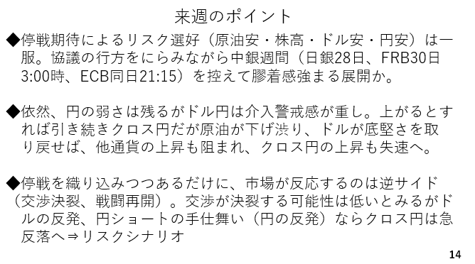 従って、円安が進むとすれば引き続きクロス円中心とは考えられますが、原油相場が下げ渋る場合、ドルも底堅さを保つでしょう。その場合、他通貨の上昇も阻まれることからクロス円の上昇も失速しそうです。尚、来週のリスクは停戦交渉の決裂でしょう。マーケットは停戦を織り込みつつあるだけに市場が強く反応するのは逆サイドに振れた場合です。