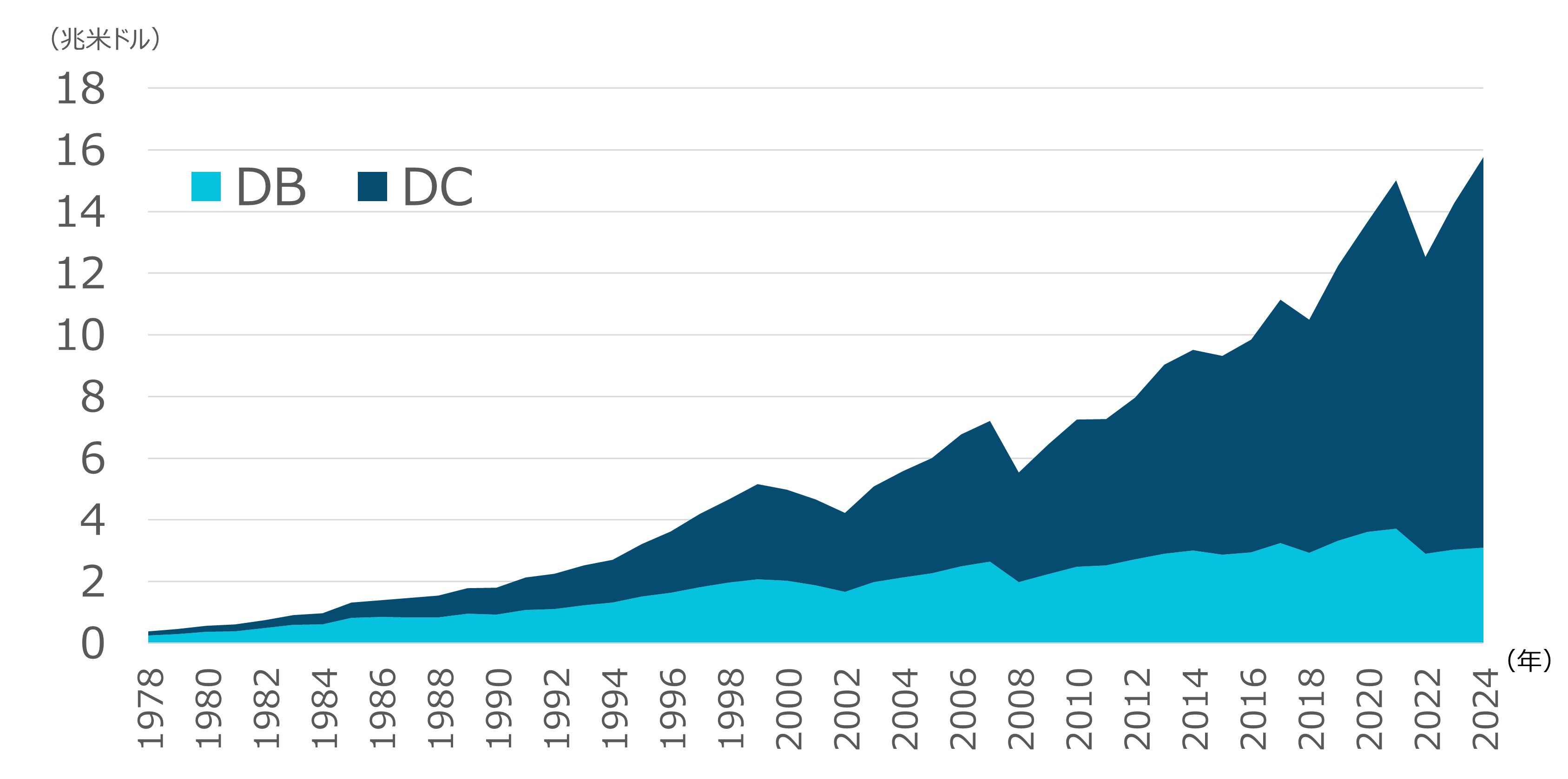 (出所)米国のDBおよびDC残高:ICI。1米ドル=157.86円(2024年12月31日時点)で円換算