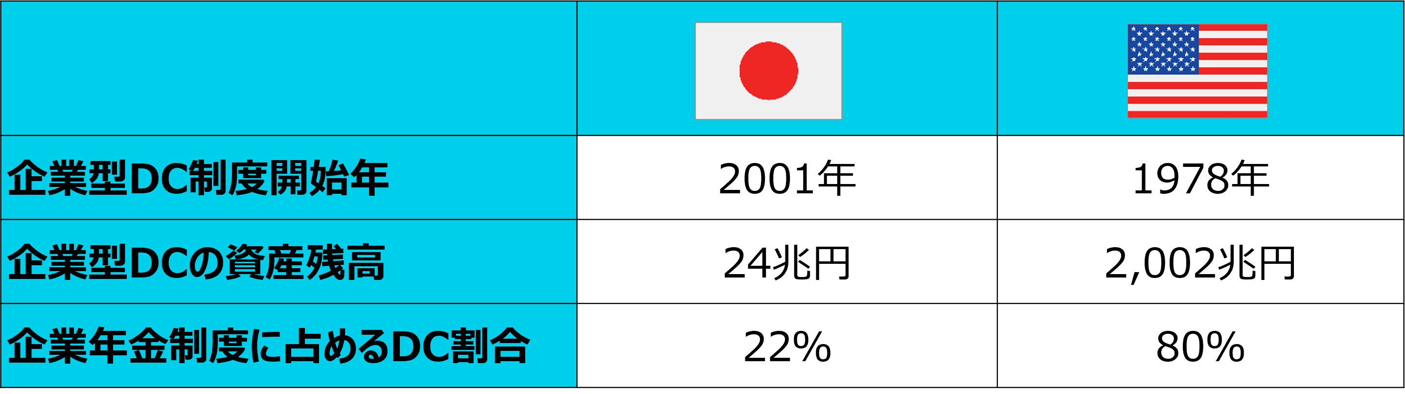 米国の確定拠出年金(DC)制度は、1974年のERISA法(米国の「Employee Retirement Income Security Act of 1974」の通称で、企業の退職給付制度を包括的に規制する連邦法)に起源を持ち、企業型DCである401(k)は1978年に制度化された。以後、長い時間をかけて普及し、1990年代前半にはすでにDBを上回る資産残高を有するまでに成長した(図①)。
