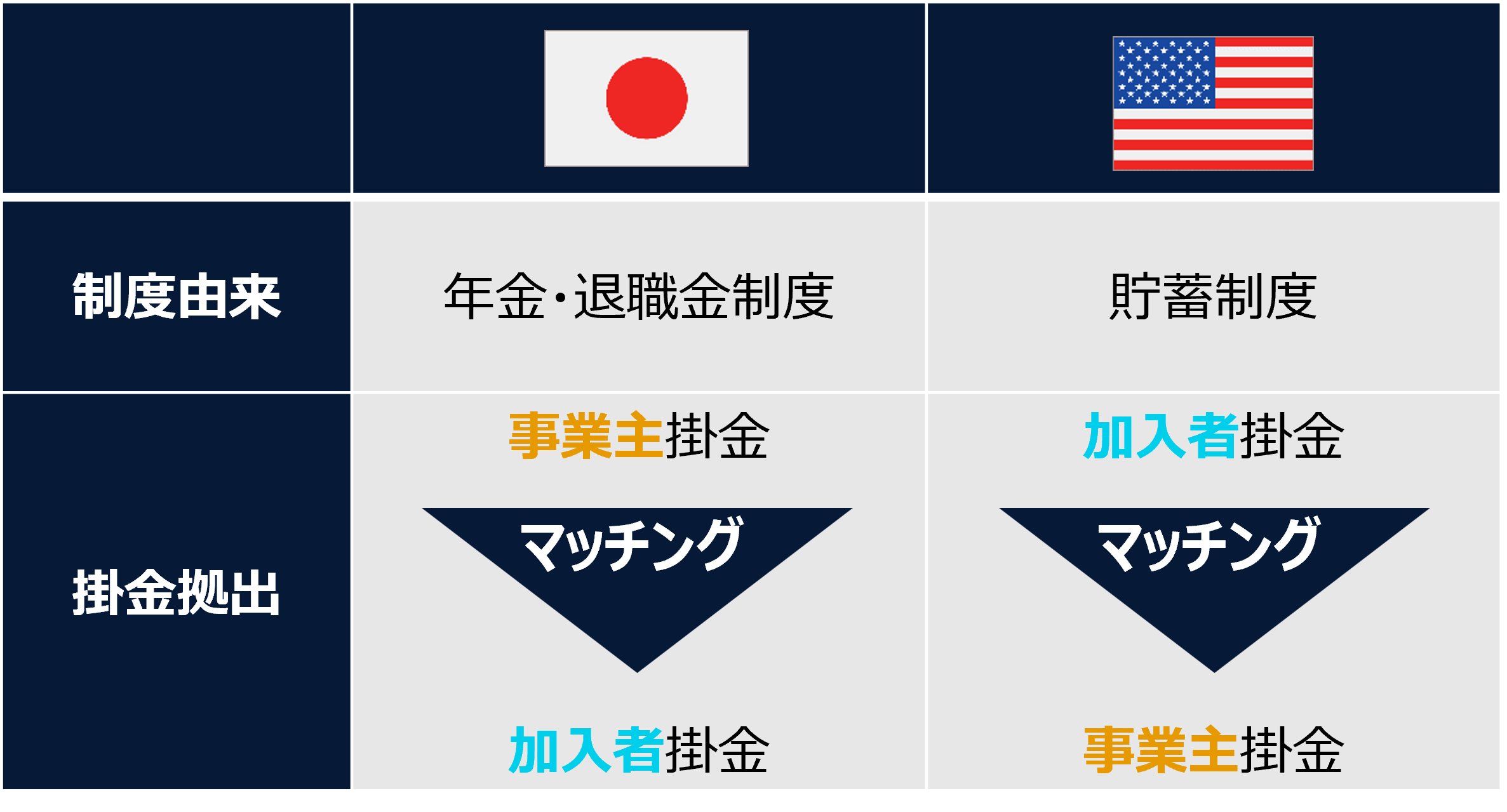 これに対して米国DCは、結果的にDBの代替機能を果たすようになったものの、出発点は加入者による自助努力型の貯蓄制度であった。つまり、まず加入者が拠出を行い、それに対して事業主がマッチングを行う、という構造である。